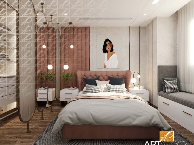 _تصميمات العناصر الموجودة بغرف النوم مهمة كذلك إذ يمكن تقسيم الغرفة لأركان متعددة كركن المكتب و حاسوب